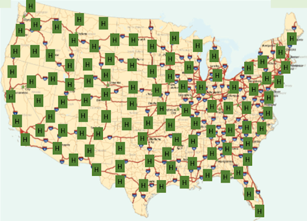 Given the LightningH’s thousand-mile range, let’s consider what first-adopters (like you and me, I suspect) might like to see on a “HydroGen Station, Version 1” map. At a minimum and just to get the trucks rolling, I’d like to have fuel within 200 miles of anywhere I drive. When I’m towing a travel trailer and my range is reduced to 500 miles, I could comfortably arrive with plenty to spare. (I could also park the trailer to regain full range, but let’s not make things difficult. 😉) To meet a goal of less than 200 miles to a station, our map fills out as shown below. (Note: California already has about 50 H-stations operating on their hydrogen highway. That’s great, but let’s keep our map simple for the moment.)